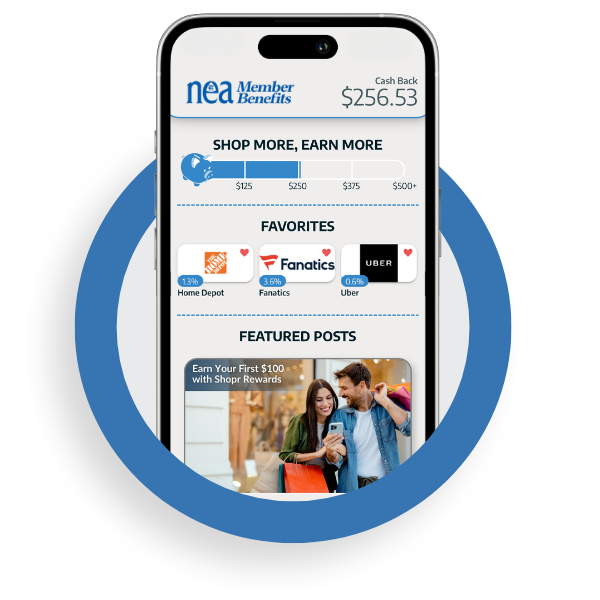 By submitting this form, I authorize Shopr Rewards and NEA Member Benefits to contact me regarding their products, services, or offers. I consent to receive communications via phone, text message, email and in-app push notifications, including automated messages. I understand that I can opt out of these communications at any time by following the instructions provided in each message or by contacting Shopr Rewards customer service department directly. I also acknowledge that the free access is contingent upon maintaining membership in good standing with NEA Member Benefits. Message and data rates may apply.